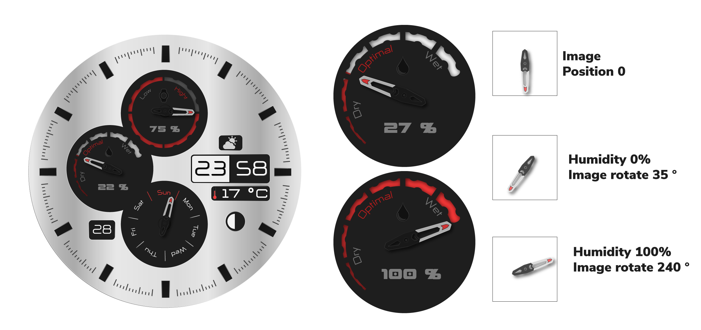 I have inserted a watch hand and set at the rotation properties Weather humidity. I have set the starting point and the end point under Rotate. I have tried a long time … I did not edit XML … all in the GWD. All settings are watching in the screenshot. I did not use tags
